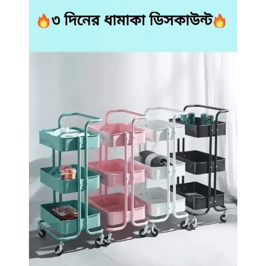 3 Layer Trolley Rack Portable 3 tier Kitchen Trolley ✨ এটা আপনি বাসা, অফিস, কিচেন, বেডরুম, বাথরুম, বুকশেলফ সহ যেকোন পারপাসে ব্যবহার করতে পারবেন খুব সহজেই। ✨ বাসা বাড়িতে এক সাথে অনেক মেহমান আসলে এক সাথে তাদের কে খাবার পরিবেশনে এটা অনেক উপকারী একটা র‍্যাক। ✨ এটার সাথে চাকা থাকায় খুব সহজেই এক জায়গা থেকে অন্য জায়গায় বহন করা জায়। ✨ ডেকোরেশন অথবা অরগানাইজেশানের কাজ কিংবা রান্নাঘরের কোনো কিছু সামলে রাখার কাজে। ✨ সবকিছু এখন গুছিয়ে রাখা যাবে একই র‍্যাক এ